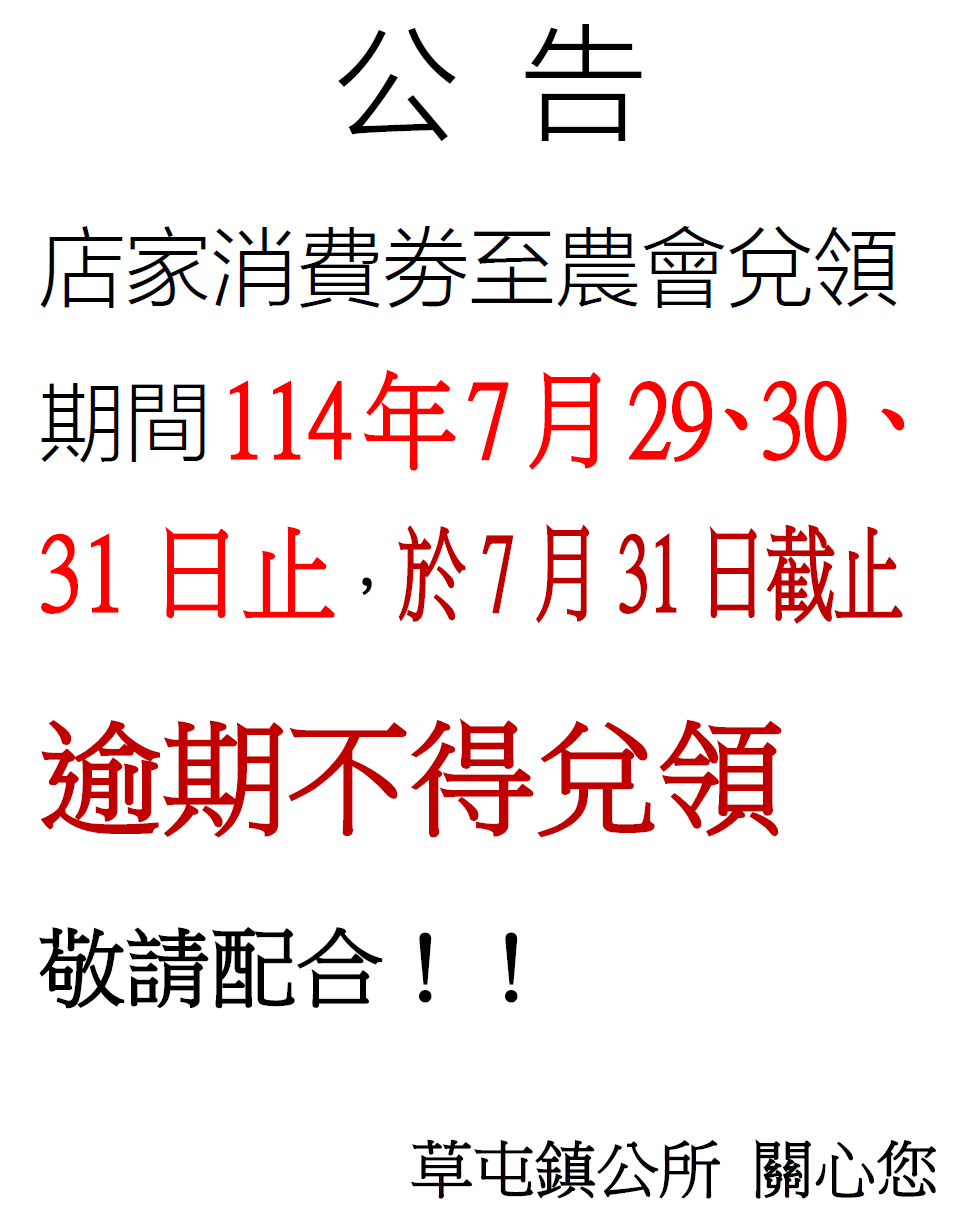 店家消費劵至農會兌領期間114年7月29、30、31日止,於7月31日截止逾期不得兌領
