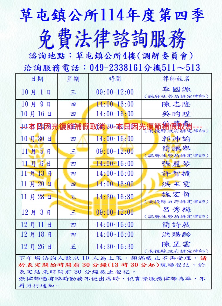 本所114年度第四季(10-12月)免費法律諮詢服務時間表已排定,請多加利用!
